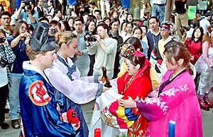 在23日(周六)举行的明洞青少年庆祝盛典中,蓝眼睛新郎引人注目.此主人翁为英国大使馆1等秘书安索尼.斯特劳克(35岁).由联合国教科文组织韩国委员会主办的此次传统婚礼试演活动中,扮演新娘的是清州大学4年级学生赵成恩.
