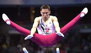 在25日(星期一)举行的体操双杠比赛中,令人遗憾地只得了银牌的李周炯正向人们展示其充满活力的技术动作.