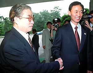 南北经济合作会谈韩国首席代表财政经济部部长助理李根京(右边)在25日南北会谈事务局举行的会谈前,与北韩首席代表郑云业握手.