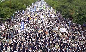 参加的全体国民谴责金大中独裁政权大会,对政府的对北政策和经济政策进行强烈的全方位的批判.