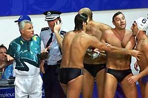 '该弄清的必须弄清楚!'29日,在男子 手球8强赛上,以5:8败给匈牙利的意大利选手们正在向主裁判(左)提出强烈抗议.