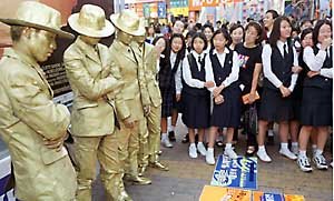正在召开釜山国际电影节的PIFF广场上,真人橱窗模特儿粉墨登场,给来看电影的市民们带来了欢乐.