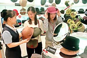 过去中年男性们常用的礼帽最近成为二、三十岁女性的流行帽而大受欢迎.原来单一的式样、暗淡的颜色也随着女性的品味而变得多彩多样.