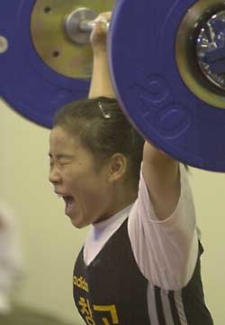 全运会首枚金牌获得者----全罗北道淳昌高的举重运动员徐丽顺,在48kg级抓举中使出浑身力量,将杠铃举过头顶.以67.5kg的成绩创学生部记录.