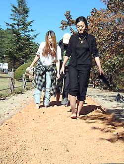 俗离山国立公园入口处建成了‘泥土路体验场’.游客们正 欢快地赤脚走在黄土路上