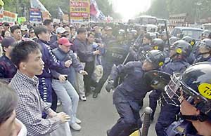20日上午,江南区韩国重工业大厦前,为反对ASEM而示威的民主劳动工会总联盟和大学生正与阻止别人进入会议场所的警察进行内斯打.
