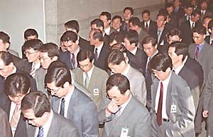 金融监督院的职员们30日在结束自律决议大会后,走出会场.职员们决心不搞在这次大会上受到道德谴责的一切股票的买卖与委托、加入私设基金等事情.