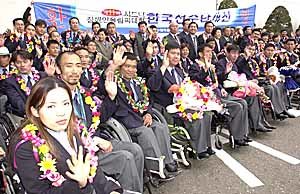 刚刚在悉尼残奥会上取得综合成绩第9名的韩国代表团1日经金浦机场回国,在机场与前来欢迎的人们挥手致意.