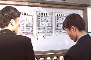 随着结构调整的深入,预计将有越来越多的失业人员涌上街头. 6日,一些最近失业的公司职员正在观看九老工业区就业招贴栏登出的招工启示.