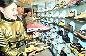在9日开始的中小风险企业优秀产品博览会上,前来参观的人们正在观赏可吸收冲击的鞋.这次在汉城汝矣岛中小企业展览厅举办的此次博览会,共有144家企业参加,到12日为止,该博览会将展出生活、文化等用品.