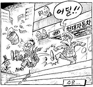 保安人员:到哪儿去!!(郑梦九会长从二楼往下看,看见郑梦宪会长正从现代汽车大楼入口处被赶出来.)