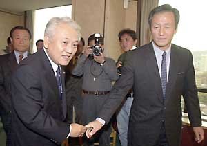 9日,文化观光部部长金汉吉(音译.左)和韩国足协主席郑梦准会面,亲切握手.