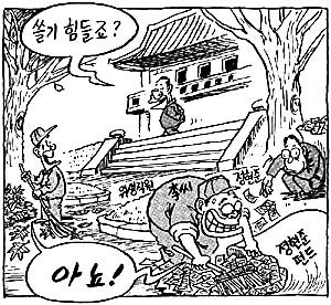 金总统(向在扫楼梯上的落叶的青瓦台卫生职员─清道夫们)说:扫得累吗?