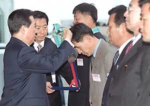 于10日进行的忠南行淡岛西海大桥开通仪式上,金大中总统正向有功之人颁发勋章.