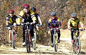 山地自行车迷郭贤(左边第二位),与爱好者协会的会员们一起,来到满山红叶的京畿道山本市水利山坡路上,使劲地踩着自行车踏板。