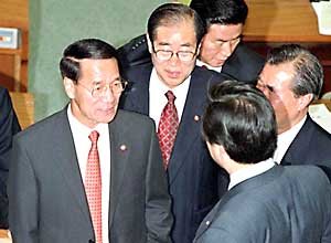 大会因为金议员的发言而中断后,民主党召开了紧急议员总会和国会对策会议,谴责金议员的发言是‘反民主、反统一的言行’,并向大国家党要求对他采取开除党籍、议员除名或者辞退等措施.朴炳锡发言人称,金议员的发言是以国民为敌、试图离间政府和国民的反民主、反统一的言行.他要求大国家党不仅要让金议员收回其发言并道歉、去除会议纪录中的发言内容,还要求大国家党出面道歉,并对金议员采取开除党籍、辞退或开除议员职务等措施.大国家党也在当天国会上由李会昌总裁主持召开了总裁团会议,一致认为金议员的发言有失妥当,决定汇集意见,对党方出面道歉及删除会议纪录等措施给予讨论,并展开了对金议员的说服工作.鉴于此,民主党总务郑均桓和大国家党总务郑昌和在国会上进行了接触,讨论了金议员发言风波的解决方案.但是,由于民主党立场强硬,目前进展较为艰难.