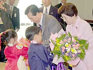 对文莱进行国事访问的金大中总统及夫人李姬镐女士,在斯里巴加湾市‘亚雅三’(音译)大厦举行的同胞恳谈会上接受花童们的花环.