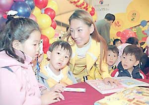 在17日汉城汝矣岛中小企业展览馆中举行的国际幼儿教育博览会会场上,孩子们好奇地看着(听着)会发声音的书.该书是根据把声音编码后记录在纸上、然后使原音重现的原理制作的.
