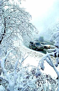 16日,江原道岭东的山间地区拉响大雪警报后,大雪纷纷而下.来往于岭东高速公路大关岭区间的车辆在结冰的道路上只能以乌龟爬行的速度前进.