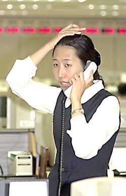 在汇率暴涨的23日下午,某女外汇经纪人在汉城外汇银行总行的交易室,交纳美元买卖定单时显得极为困惑.