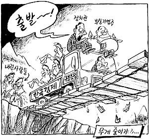 状况:金总统开着一辆名为‘韩国经济结构调整’的卡车正艰难地通过不坚固的木桥.其左面站着哭泣的下岗工人,卡车拖斗上同样不安的工人们正在和已经下车的同事们道别.