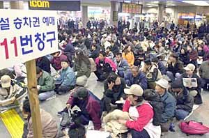 28日开始出售春节期间的火车票,来买湖南线和全罗线车票的人一大早就在汉城火车站排队等候. 铁道厅29日预售京釜线,30日预售中央线等其他路线的火车票.
