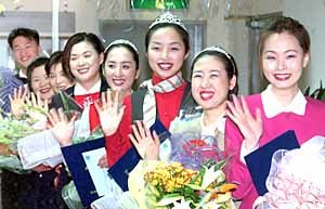 29日,在汉城金浦机场举行的‘微笑女王选拔大赛’上,韩亚航空的李贤珍(音)(右起第三位)获得大奖,所有的获奖者及参赛者都露出灿烂的笑容.