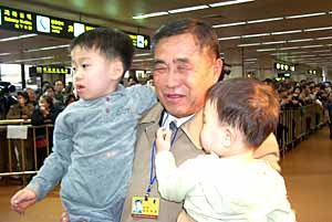 曾经在首次离散家族访问中把自己的访问机会让给别人的禹元邢(音译),于2日上午乘坐高丽航空的飞机到达汉城金浦机场,用双手将前来迎接他的孙子们揽进怀里。
