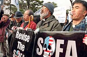 本周三 在汉城龙山战争纪念馆前, 老跟里事件对策委员会会员们进行示威, 要求修改韩美行政协定等.