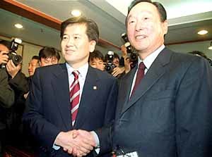 7日上午, 民主党最高委员会议结束后, 权鲁甲最高委员(右)和郑东泳最高委员微笑着握手.
