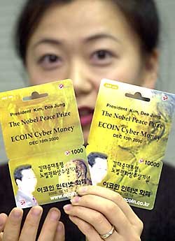 发行因特网电子货币的ecoin(www.ecoin.co.kr)公司,为纪念金总统荣获诺贝尔和平奖, 发行了面值1000韩元和10000韩元的两种货币, 并正在向顾客赠送这种礼物.