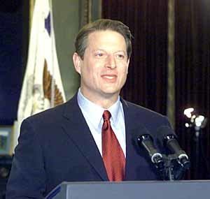13日晚,美国民主党总统候选人戈尔在华盛顿的副总统办公室里, 向国民进行了承认竞选失败的演说. 他表示,虽对联邦最高法院的裁决有所不满, 但为维护美国的团结一致,接受这一判决.