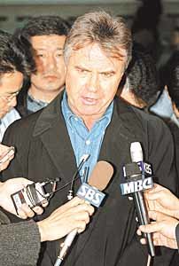 一日之间成为“韩国足球的希望”的荷兰主教练希丁克(54)17日来到韩国. 他始终信心十足的表示:“将全力以赴,提高韩国足球的竞技力量.”希丁克教练将于19日到日本与国家队见面,20日观看韩日对抗赛,21日回荷兰, 明年1月開始正式上马.