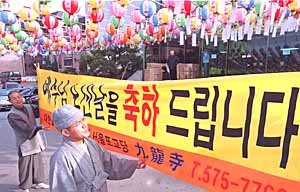 位于汉城瑞草区良才洞的九龙寺法师们19号在布满莲花灯笼的佛堂前院, 挂起了一个写着"庆祝耶稣诞生"的标语. 寺院里庆祝圣诞节的活动被认为是超越宗教界限的美举.
