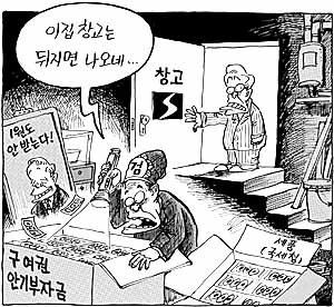 前任总统金泳三的照片(左)上写着“一分钱也不收”的字样,右边却能看到装满钱的箱子。金泳三总统上台时,因国税厅介入大选而引起了所谓“税风”的风波。