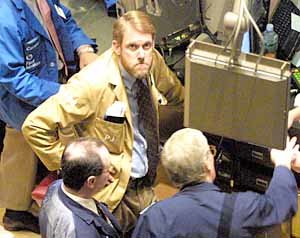 5日纳斯达克指数突然暴跌,纽约证券交易所的一位职员以沉重的表情看着股市行情电子标示板。今年年初开盘时一度暴涨的纽约股市,因对未来景气的不安情绪扩散,比前一天下降了6.2%。
