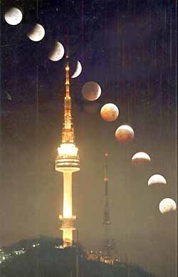 10日出现了21世纪第一个月全蚀现象的宇宙秀。上午2点45分5秒,太阳、地球和月球排成直线后,紧接着在4点49分5秒开始了由地球影子遮盖月球的月全蚀现象。照片是每隔20分钟拍摄月球后,合成制作的。本次月全蚀现象一直进行到7点左右。