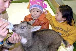 一群小孩子们11日在京畿道龙仁市爱宝乐园里好奇地看着饲养员给山羊“圣诞老人”喂奶。 去年12月24号出生的“圣诞老人”是国家指定的天然纪念动物第217号。