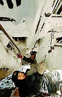 14日,铁道厅汉城车辆事务所的验收员们正在清除火车底盘下的结冰。