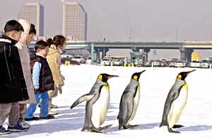 17日上午,63CITY的王企鹅群,到遍布积雪的汉城汝矣岛的汉江边散步。这群王企鹅仿佛回到老家一样,尽情享受刺骨的江风。在摇摇摆摆地走动着的这一群王企鹅后面,有一群快乐的小孩正模仿企鹅走路的样子。