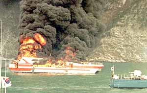 17日,在仁川前海行驶的客船“民主2号”突然发生火灾,海军舰艇为抢救乘客目前正在努力靠近客船。