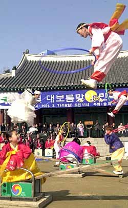 7日(正月十五),汉城松坡区汉城游乐场举行的传统民俗游戏大会上,一群小学生正在用带有健身圈的跳板进行演出。
