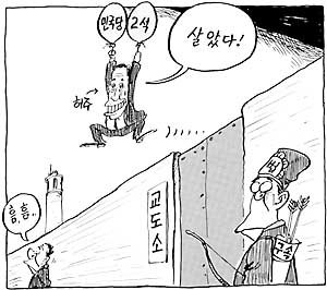 金润焕(吊在写有“民国党2席”的两个小气球飞出监狱):解放了!