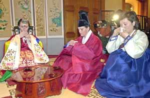 13日上午,“韩国茶文化活动” 在汉城希尔顿饭店举行,在这次活动中,一些驻韩美国妇女身着韩服品尝着传统的韩国茶,以体会韩国传统文化。