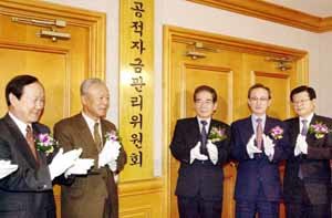 19일 서울 명동 은행회관에서 열린 공적자금관리위원회 첫 회의에 앞서 진념 경제부총리(왼쪽에서 세번째)와 민간위원장으로 선정된 박승 중앙대 교수(왼쪽에서 두번째) 등 주요 참석자들이 현판식을 마친 뒤 박수를 치고 있다.
