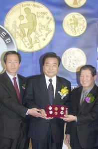 负责为韩国世界杯足球赛组织委员会(KOWOC)代理销售纪念币的华东公司6日在汉城希尔顿饭店举行了正式纪念货币上市的新闻发布会,国务总理李汉东与世界杯足球赛组织委员会共同委员长郑梦准与李衍泽出席祝贺。新闻发布会上宣布,将从19日开始受理第一批纪念币的订货申请。