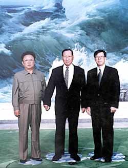 前现代集团名誉会长、已故郑周永99年10月访问北韩,与北韩国防委员长金正日以及现代峨山理事会会长郑梦宪拍摄纪念照。