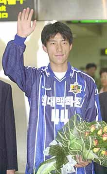 他于23日抵达韩国金浦机场,24日将与郁山现代职业足球俱乐部签合同,契约金额7500万元,年薪3600万元,为期两年。若他每年参加10场以上比赛,可再领取2500万元的契约金。他是第一个以北韩国籍在国内就业的人。