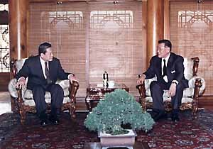 现代起亚汽车公司会长郑梦九(右)30日在汉城龙山区汉南洞三星迎宾馆承旨院,向三星公司会长李建熙表示谢意。