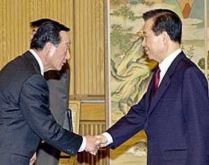 金大中总统2日宴请自由总联盟干部,并在青瓦台迎宾馆举行了茶话会。图为金总统正在与联盟顾问兼民主党顾问权鲁甲议员握手致意。